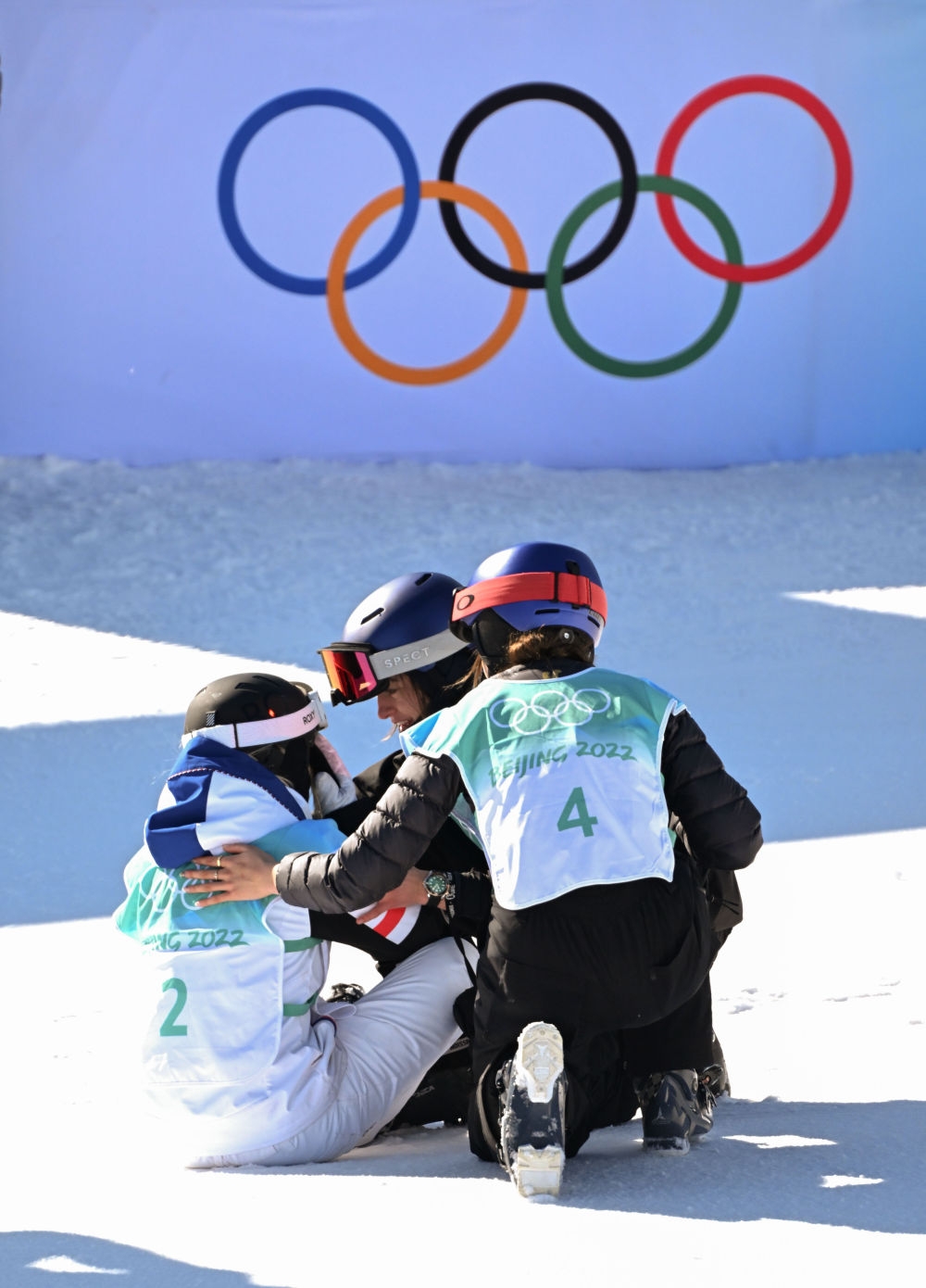 2月8日,中国队选手谷爱凌(右)和瑞士队选手玛蒂尔德·格雷莫德(中)在比赛后安慰法国队选手泰丝·勒德。新华社记者 武巍 摄