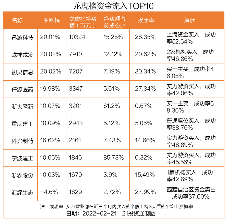 2月21日,上证指数收平,深证成指上涨0.09%,创业板指下跌0.79%。盘后龙虎榜数据显示,共有35只个股因当日异动登上龙虎榜,资金净流入最多的是迅游科技(300467.SZ),达1.03亿元。