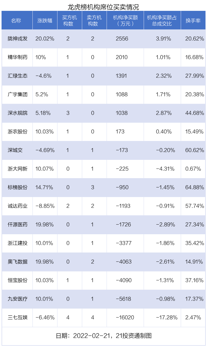 2月21日,16只个股龙虎榜出现了机构的身影,机构合计净卖出2.92亿元。具体来看,机构净买入6股,净卖出10股。