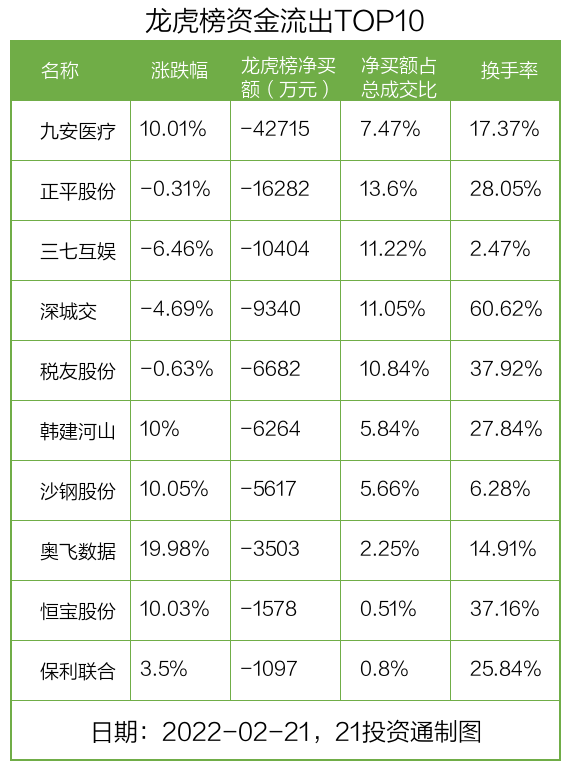 而龙虎榜中资金净流出最多的是九安医疗(002432.SZ),被净卖出为4.27亿元,占总成交金额的7.47%。九安医疗收盘上涨10.01%,换手率为17.37%。
