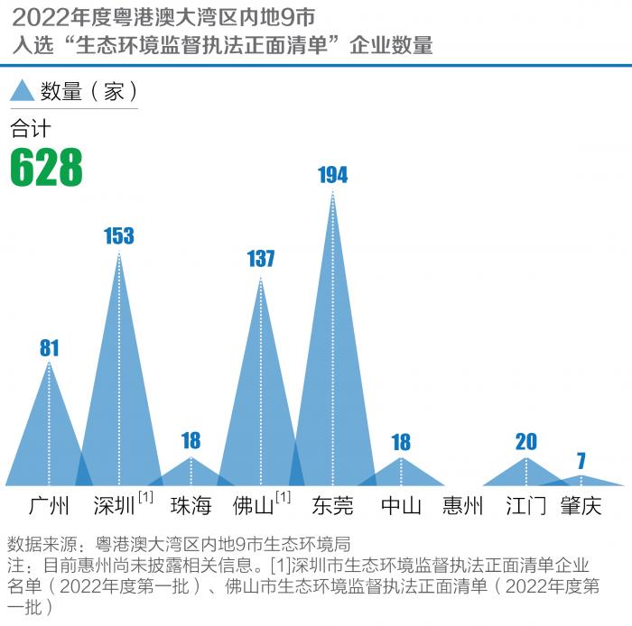 近日,粤港澳大湾区内地9市正陆续公布2022年生态环境监督执法正面清单(以下简称“正面清单”)。目前除惠州尚未披露相关信息外,粤港澳大湾区已有628家企业入选正面清单,可在三年有效期内接受非现场执法检查及财税、金融等其他正向激励措施。