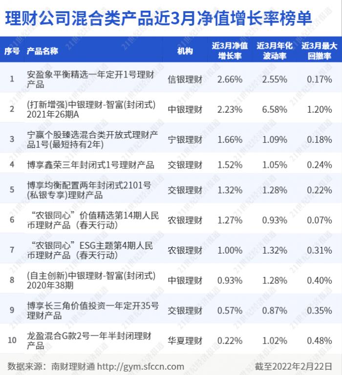 理财公司混合类产品近3月净值增长率榜单(截至2月22日)