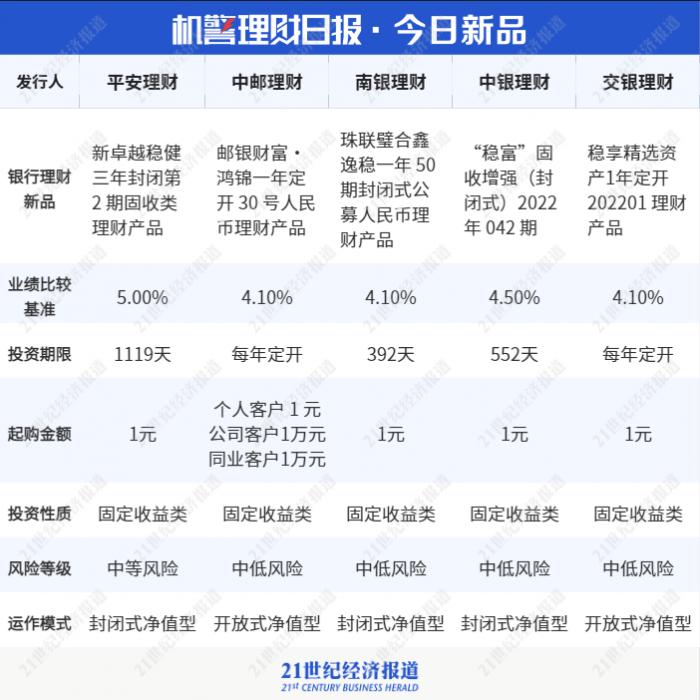 南财理财通课题组选取了5只理财新品供参考。据南财理财通数据显示:近期,在多家理财公司的理财新品中,平安理财新卓越稳健三年封闭第2期固收类理财产品值得关注,该产品主要投资于固定收益类资产,同时进行稳健的权益类资产投资。风险评级为R3(中等风险),业绩比较基准为5.00%,投资期限为1119天。该产品在固定收益投资方面将加强信用风险和市场风险把控,并严格控制组合久期,债权与非标资产投资相结合,降低产品收益率波动。权益投资在严格控制配置比例的基础上,着重配置风险中性策略资产,控制产品收益波动的前提下实现资产稳健增值。