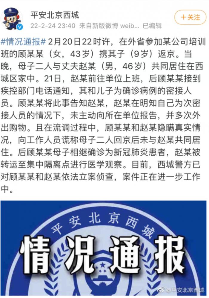 据@平安北京西城,2月20日22时许,在外省参加某公司培训班的顾某某(女,43岁)携其子(9岁)返京。当晚,母子二人与丈夫赵某(男,46岁)共同居住在西城区家中。