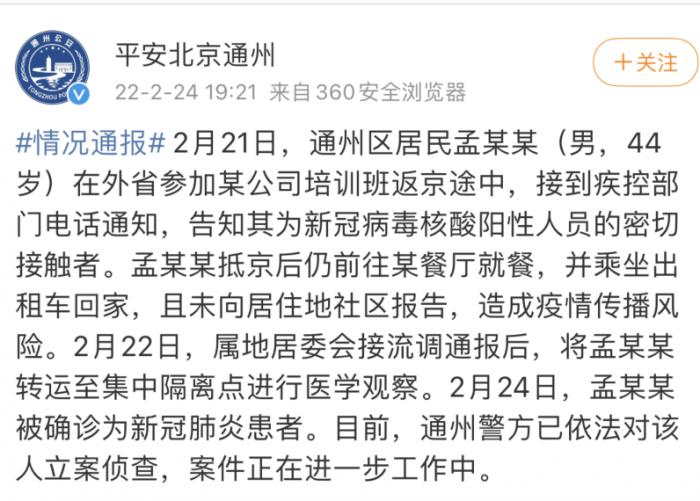 2月22日,属地居委会接流调通报后,将孟某某转运至集中隔离点进行医学观察。2月24日,孟某某被确诊为新冠肺炎患者。目前,通州警方已依法对该人立案侦查,案件正在进一步工作中。