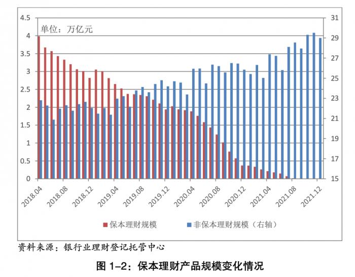 一是保本理财产品实现清零。截至2021年底,保本理财产品规模已由资管新规发布时的4万亿元压降至零,基本完成银行理财业务过渡期整改任务,市场上的刚兑预期逐步被打破。