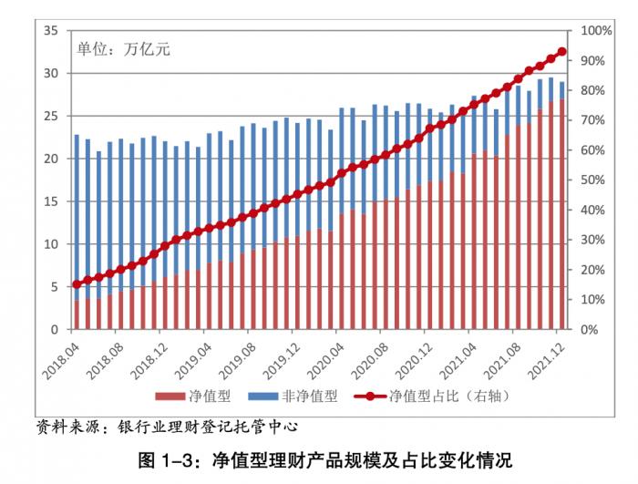 二是净值型产品比例大幅增加。截至2021年底,净值型理财产品余额26.96万亿元,占比92.97%,较资管新规发布前增加23.89万亿元,产品净值化转型进程显著;非净值型产品余额为2.04万亿元,较资管新规发布前大幅减少16.39万亿元。