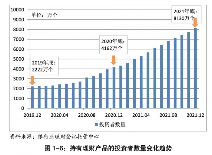 截至2021年底,存续银行理财产品3.63万只;持有理财产品的投资者数量达到了8130万个,创历史新高,同比增长95.31%,其中个人投资者仍占据理财市场绝对主力,数量占比高达99.23%。