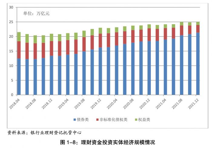 一是服务实体经济质效大幅提升。截至2021年底,银行理财产品通过投资债券、非标准化债权、未上市股权等资产,支持实体经济资金规模约25万亿元,相当于同期社会融资规模存量的8%,有效实现资金与实体经济融资需求对接。