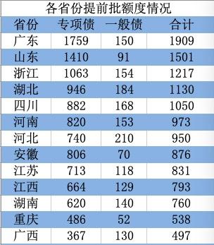 据21世纪经济报道记者梳理,获得提前批地方债额度最多的为广东省,额度为1909亿,其次为山东(1501亿)、浙江(1217亿)。
