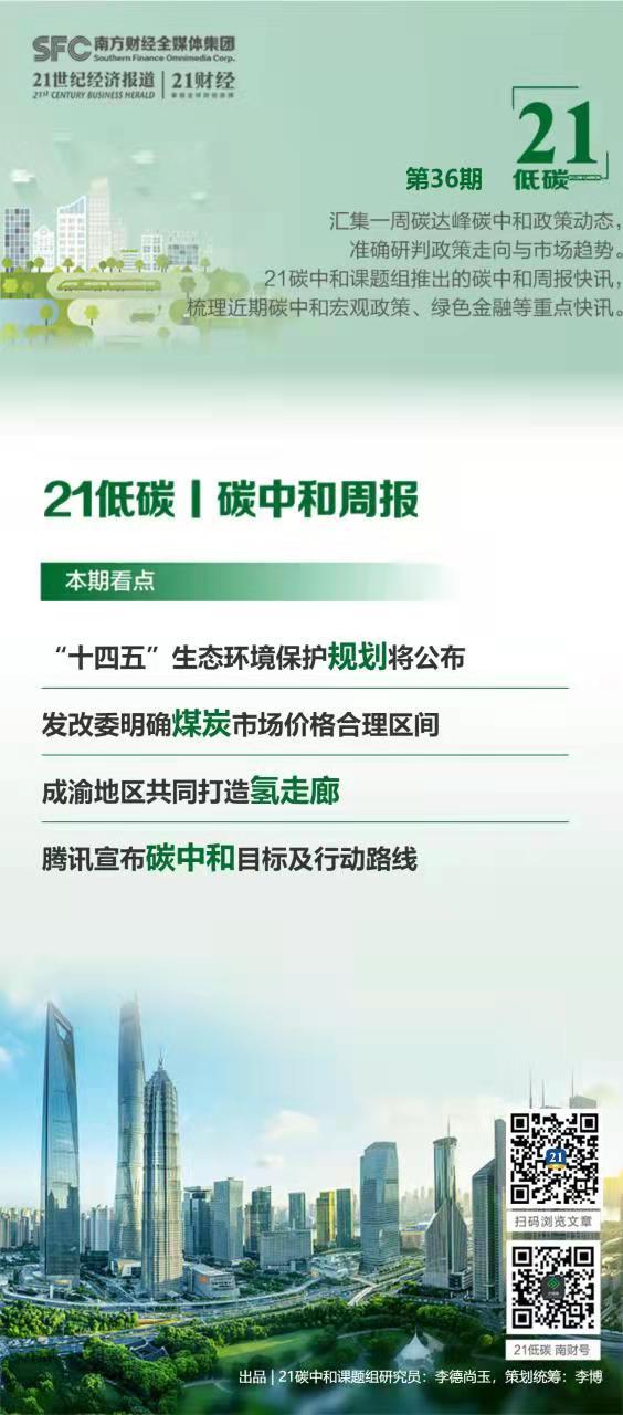 本期看点:“十四五”生态环境保护规划将公布,部署12个重点任务;发改委明确煤炭市场价格合理区间,每吨570-770元;成渝共同打造氢走廊,争创国家氢燃料电池汽车示范城市群;腾讯宣布碳中和目标:不晚于2030年实现自身运营及供应链碳中和。