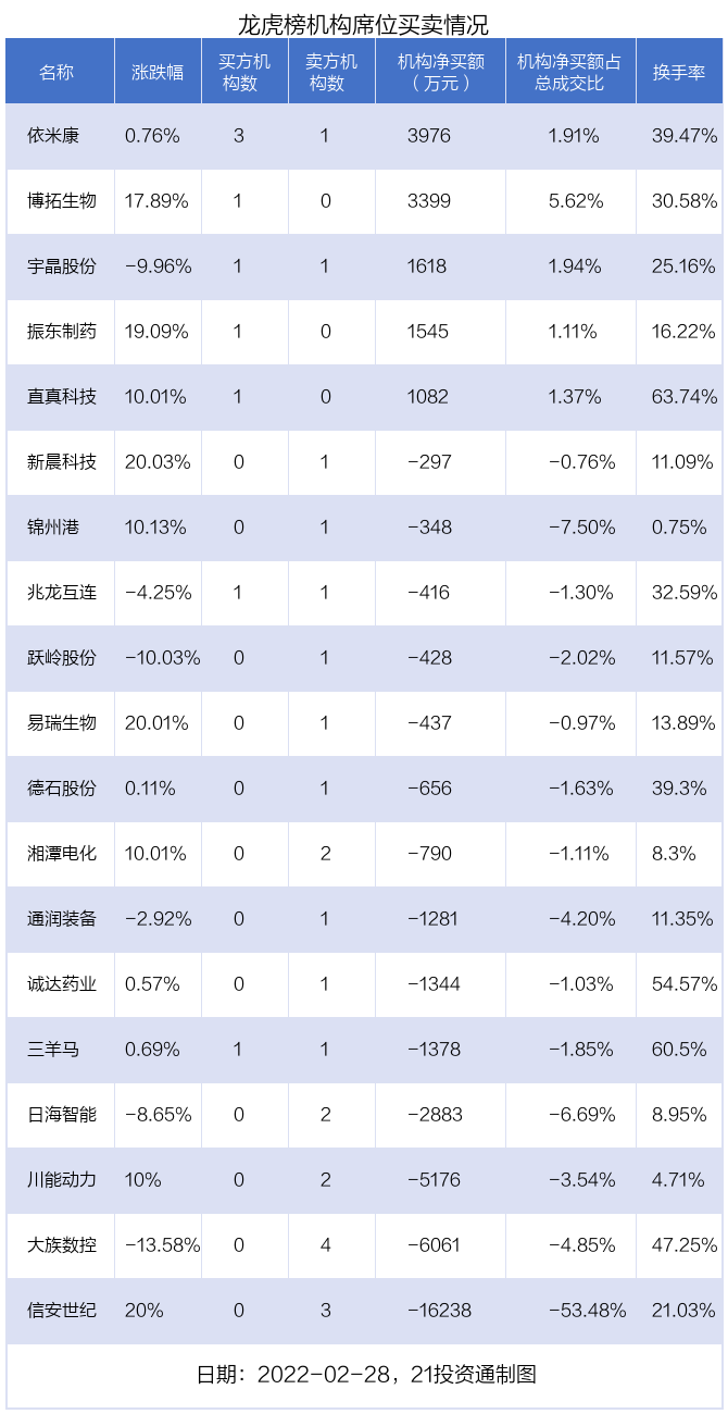 其中,机构净买入金额最多的是依米康(300249.SZ),当日收盘上涨0.76%,换手率为39.47%。