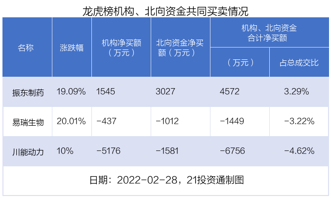 值得注意的是,机构和北向资金共同净买入了振东制药等1股;共同净卖出了易瑞生物、川能动力等2股。