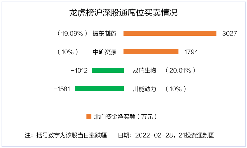 2月28日,北向资金参与龙虎榜中的个股共有4只,合计净买入2228.78万元。深股通净买入2 股,净卖出2 股,合计净买入2228.78万元。