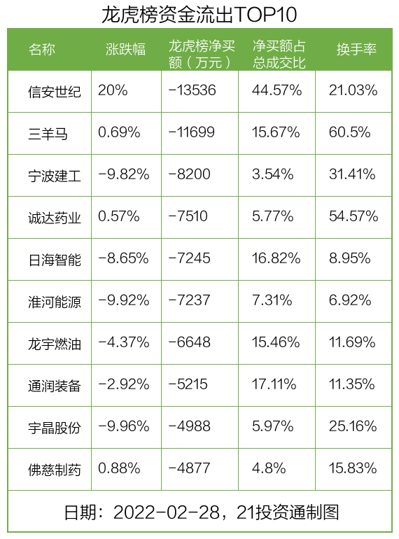 而龙虎榜中资金净流出最多的是信安世纪(688201.SH),被净卖出为1.35亿元,占总成交金额的44.57%。信安世纪收盘上涨20%,换手率为21.03%。