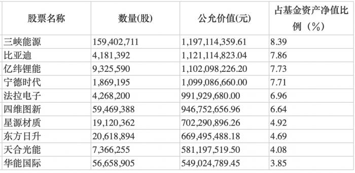 前海开源新经济A的前十大重仓股,包括三峡能源、比亚迪、亿纬锂能、宁德时代等10只新能源板股票。
