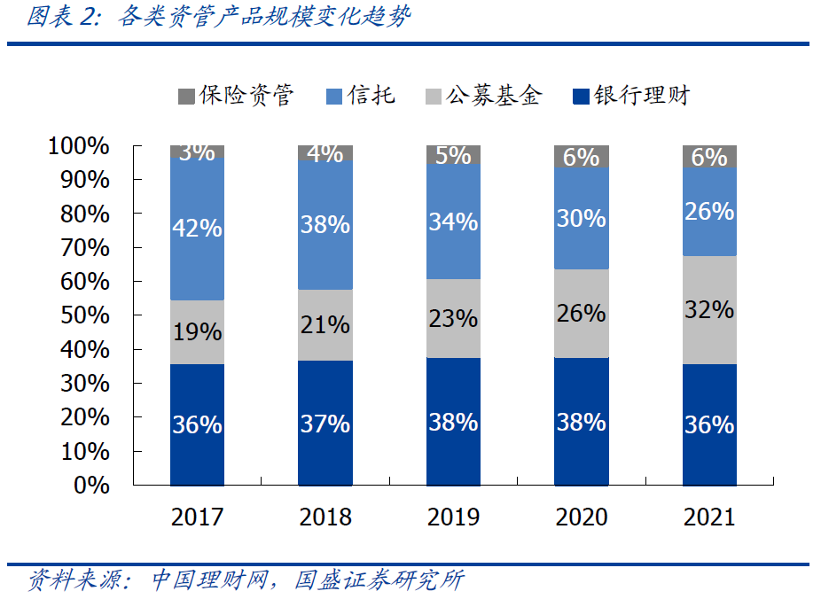非保本理财规模持续扩张,保本理财产品实现清零。2021年底银行非保本理财产品存续29万亿,同比增长12.14%,存续产品3.63万只,同比小幅减少6.9%。全年来看,非保本理财规模在去年上半年减少0.06万亿,三四季度分别增加2.15万亿和1.05万亿。而保本理财产品规模已由资管新规发布时的4万亿压降至零。因此过渡期整改任务基本完成,刚兑预期逐步被打破。整个大资管行业来看,与公募基金、信托、保险资管等其他类型资管产品相比,银行理财产品存续规模已连续三年居首位,而通道类信托业务规模占比不断下降。2017年以来公募基金在资管产品中增加的份额基本上等于信托减少的份额,前者占比提升13个百分点至32%,后者占比下降16个百分点至26%。2021年公募份额也第一次超过信托。