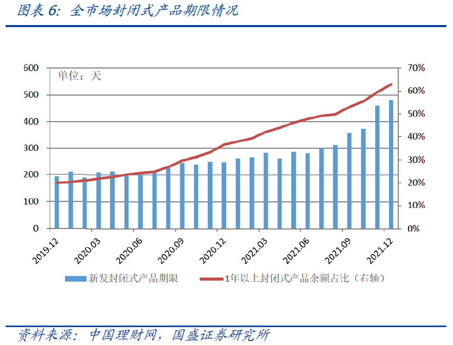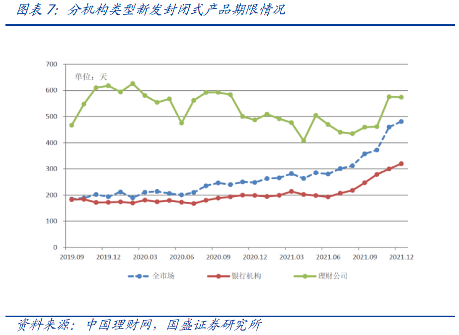 产品结构优化调整,开放式产品存续规模及占比增多,封闭式理财产品期限不断拉长。2021年底开放式理财产品存续23.78万亿,同比增长16.63%,占全部理财产品存续余额的82%,较上年同期增加3.15个百分点;封闭式理财产品存续5.22万亿,占全部理财产品存续余额的18%。就封闭式产品而言,资管新规发布时全市场新发封闭式理财产品平均期限为138天,2021年12月则大幅增长至481天。1年以上的封闭式产品存续余额占比持续上升,21年底占封闭式产品比重62.96%,较资管新规发布前提高54.8个百分点。分机构类型来看,银行机构新发封闭式理财产品加权平均期限总体呈上升态势,理财公司产品平均期限虽有波动,但始终明显高于行业平均水平。2021年12月银行机构新发封闭式理财产品加权平均期限为320天,同比增长61.07%;理财公司新发封闭式产品加权平均期限为574天,同比增长17.83%。