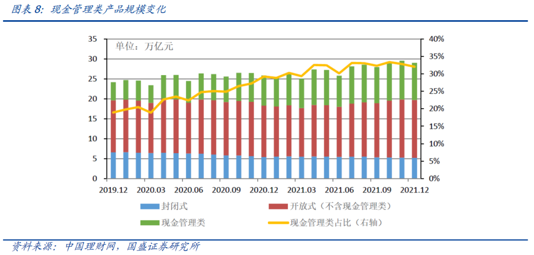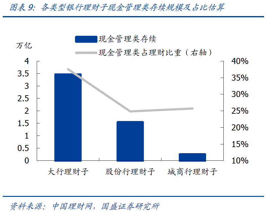 估算大行理财子现金管理类产品还未达到监管规模要求,预计在今年将继续压降。2021年颁布的现金管理类正式稿对规模限制之一为“同一商业银行采用摊余成本法进行核算的现金管理类产品的月末资产净值,合计不得超过其全部理财产品月末资产净值的30%”,并要求在2022年底过渡期结束前完成整改。结合各类型银行理财子现金管理类产品占开放式产品余额比重和开放式产品规模,我们可以估算各类型银行理财子现金管理类规模占存续理财产品比重。整体来看,大行理财子还未达到监管要求,因此在今年预计将继续压降。