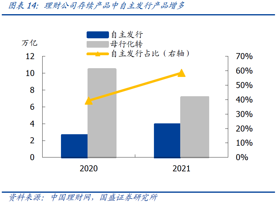 从新发产品募集规模来看,理财公司也成为市场重要机构类型。2021年理财公司募集资金规模44.08万亿,同比增长191%,占全市场的比例达到36.08%,高于银行机构。理财公司自主发行产品占比不断增加,2021年底达58.51%,较上年同期增加19.2个百分点。