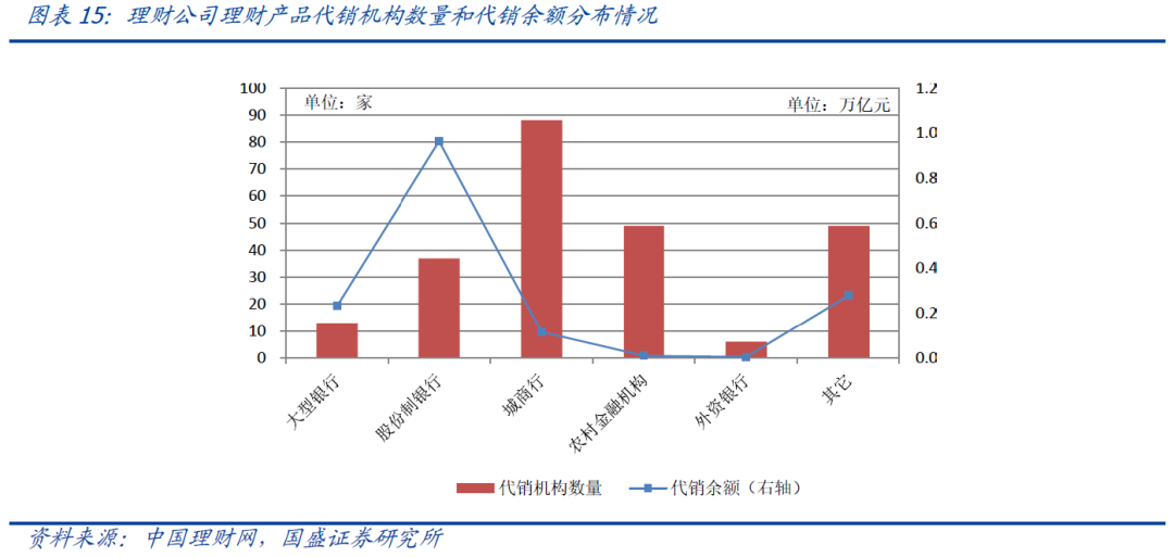 难以形成投研优势的部分中小银行转向代销业务。商业银行设立理财子公司开展资管业务,有利于强化银行理财业务风险隔离,推动银行理财回归资管业务本源。但受限于成立理财子公司的多种显性及隐性标准,部分中小银行难以设立理财子公司。2021年底存续理财产品的机构数量较资管新规发布前减少了90家,因为部分中小银行受限于投研能力不足,长期难以形成理财业务优势,进而不再发行理财产品,而是通过产品代销继续参与理财业务,充分发挥自身在客户资源、销售渠道等方面的独特优势,逐渐成为理财产品代销的重要力量。