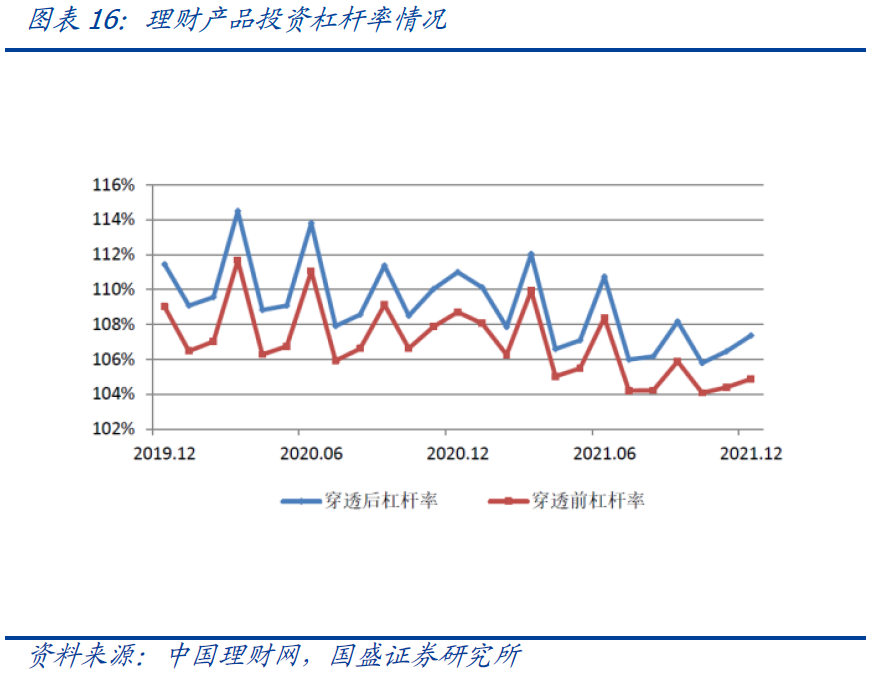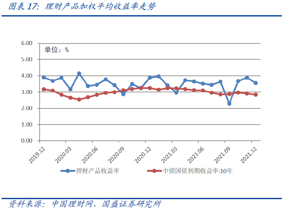 理财产品杠杆率小幅下降,收益率相对保持平稳。2018年9月银保监会发布《商业银行理财业务监督管理办法》,规定商业银行每只开放式公募理财产品的杠杆水平不得超过140%,每只封闭式公募理财产品、每只私募理财产品的杠杆水平不得超过200%。商业银行计算理财产品总资产时,应当按照穿透原则合并计算理财产品所投资的底层资产。2021年底理财产品投资资产合计31.19万亿,理财产品杠杆率107.37%,较上年同期减少3.63个百分点。去年12月理财产品加权平均年化收益率3.55%,较上年同期减少34BP,高出10年期国债收益率72BP,收益率相对较平稳。