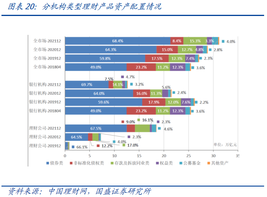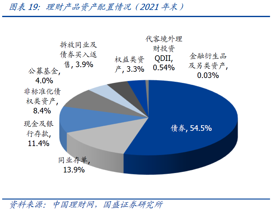 资产配置来看,债券方面,2021年底理财资金投向债券类余额为21.33万亿,占总投资资产的68.39%,其中债券投资17万亿,同业存单投资4.3万亿,全年来看分别增加0.99和1.81万亿。非标方面,在严格期限匹配要求和通道业务持续压降情况下,非标压缩非常明显。2021年底理财资金投向非标准化债权类资产余额2.62万亿,占总投资资产的8.4%,减少上万亿。2021年理财对债券投资增加近万亿,主要受益于非标转标和债市处于牛市环境,而今年随着非标压降难度加大以及债市环境改变,预计很难再有这么大规模的增量提升,对债市需求端影响预计减弱。
