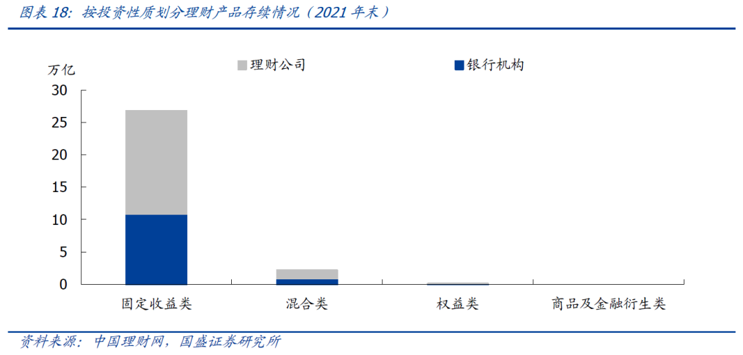 理财产品投资类型以固定收益类为主,且存续规模及占比不断上升。2021年底固定收益类理财产品存续余额为26.78万亿,同比增长22.8%,占全部理财产品存续余额的92.34%,较上年同期增加8个百分点。其中理财公司和银行机构固定收益类理财产品分别为15.92万亿和10.86万亿。