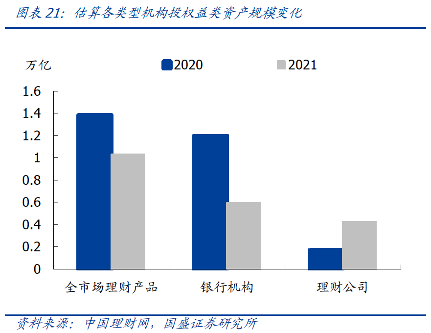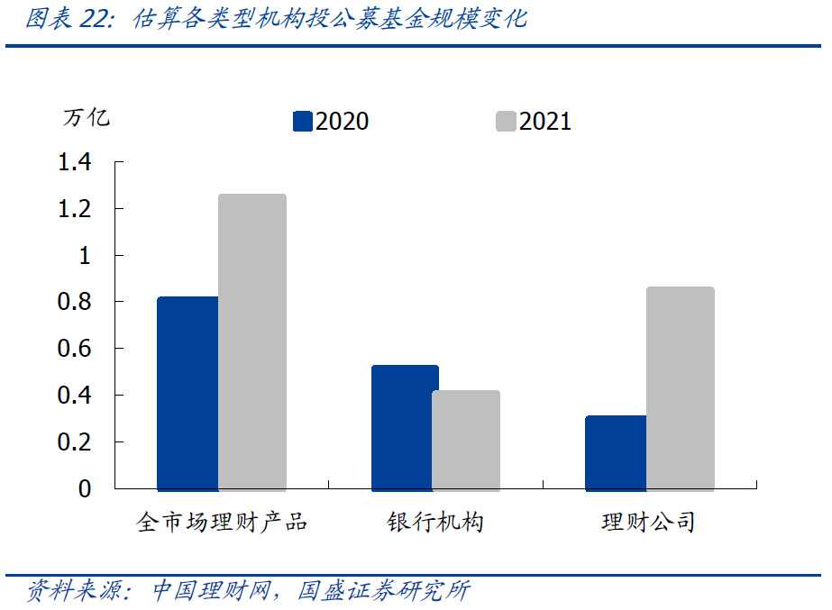 理财产品投资公募基金规模增加,直接投资权益类资产规模略降,但考虑到投资的公募基金底层还有权益资产,因此对权益类资产投资未必减少。理财产品投资资产合计31.19万亿,权益类资产和公募基金占比分别为3.3%和4%,估算分别为1.03和1.25万亿,与上年相比权益类资产减少0.34万亿,公募基金投资增加0.44万亿。其中理财公司对权益类资产和公募基金投资增加0.25万亿和0.55万亿,主要由于理财公司产品规模增加以及投资比率也有所上升。对于理财公司理财产品而言,主要是混合类产品配置公募基金和权益类资产规模大。此外随着FOF型理财产品发展,对公募基金投资也增加,21年底FOF型理财存续1536亿元,投资公募基金规模约725亿元,且以债券基金为主。