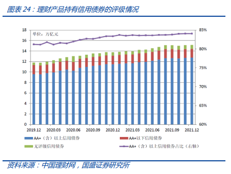 从配置债券类别来看,理财产品持有中高评级信用债为主。2021年底理财产品持有信用债15.17万亿,占总投资资产的48.13%,占比较上年同期增加0.38个百分点;持有利率债1.83万亿,占总投资资产的5.81%,持有同业存单约4.3万亿。从债券评级来看,理财产品持有AA+及以上信用债规模达12.75万亿,占持有信用债总规模的84.05%,占比较上年同期增加0.69个百分点。估值方法转变,理财净值波动加大,将更加偏好中高评级债券。