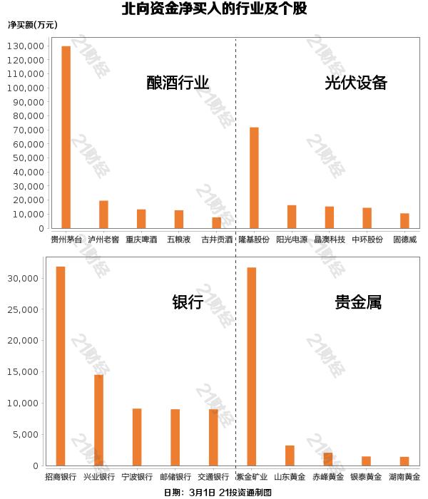 个股方面,北向资金净买入贵州茅台(600519.SH)、隆基股份(601012.SH)、赣锋锂业(002460.SZ)、招商银行(600036.SH)、紫金矿业(601899.SH)居前,其中,贵州茅台被净买入12.98亿元,隆基股份被净买入7.19亿元,赣锋锂业被净买入4.35亿元,招商银行被净买入3.19亿元,紫金矿业被净买入3.17亿元。