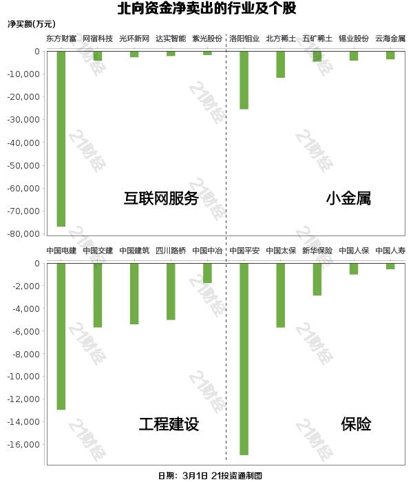 北向资金减持了45个行业,其中互联网服务最多,净卖出金额达8.80亿元,其次是小金属行业,净卖出5.83亿元。