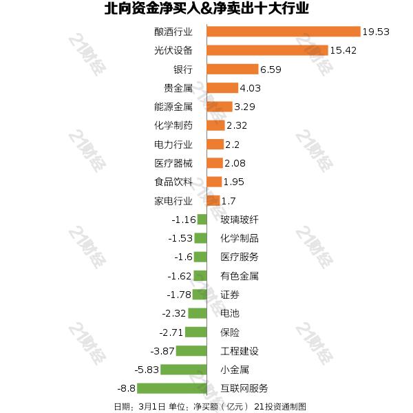 从净买入金额来看,北向资金增持了55个行业,其中酿酒行业居首,净买入金额达19.53亿元,其次是光伏设备行业,净买入15.42亿元。