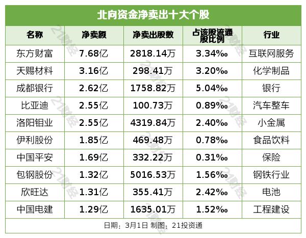 北向资金净卖出东方财富(300059.SZ)、天赐材料(002709.SZ)、成都银行(601838.SH)、比亚迪(002594.SZ)、洛阳钼业(603993.SH)居前,其中,东方财富被净卖出7.68亿元,天赐材料被净卖出3.16亿元,成都银行被净卖出2.62亿元,比亚迪被净卖出2.55亿元,洛阳钼业被净卖出2.55亿元。