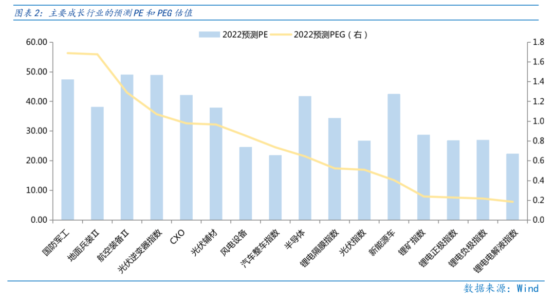 从2022年预测PE和PEG来看,2022年预测PE较低的是汽车整车、锂电电解液、风电设备、光伏和锂电正极等行业,2022年预测PEG较低的是锂电电解液、锂电负极、锂电正极和锂矿等行业。新能源车细分的锂电隔膜、锂电负极、锂电锂矿、锂电电解液等细分行业估值“双低”值得特别关注。