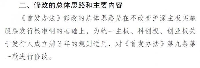 证监会表示,《首发办法》修改的总体思路是在不改变沪深主板实施股票发行核准制的基础上,为统一主板、科创板、创业板关于发行人成立满3年的规则适用,对《首发办法》第九条第一款进行修改。
