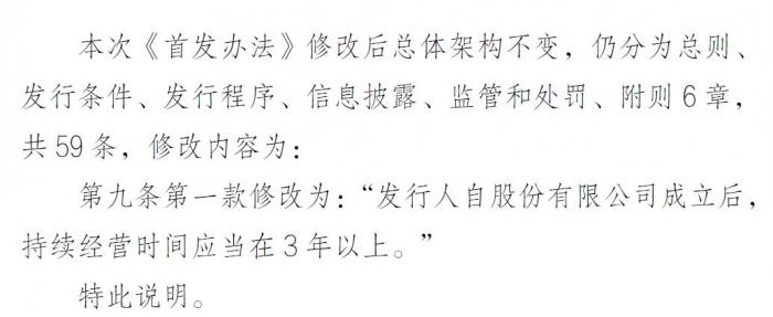 本次《首发办法》修改后总体架构不变,仍分为总则、发行条件、发行程序、信息披露、监管和处罚、附则6章,共59条,修改内容为:第九条第一款修改为:“发行人自股份有限公司成立后,持续经营时间应当在3年以上。”
