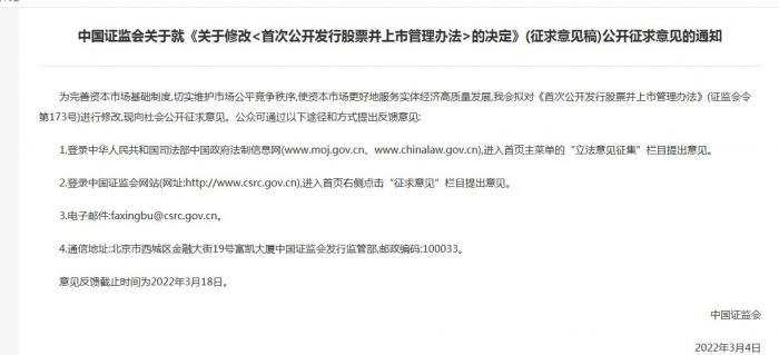 为完善资本市场基础制度,切实维护市场公平竞争秩序,使资本市场更好地服务实体经济高质量发展,中国证监会拟对《首次公开发行股票并上市管理办法》(证监会令第173号)进行修改,现向社会公开征求意见。
