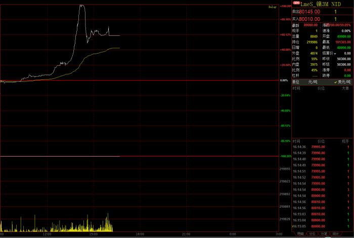 最后交易时间,LME镍报于80010美元/吨,上涨59.05%。