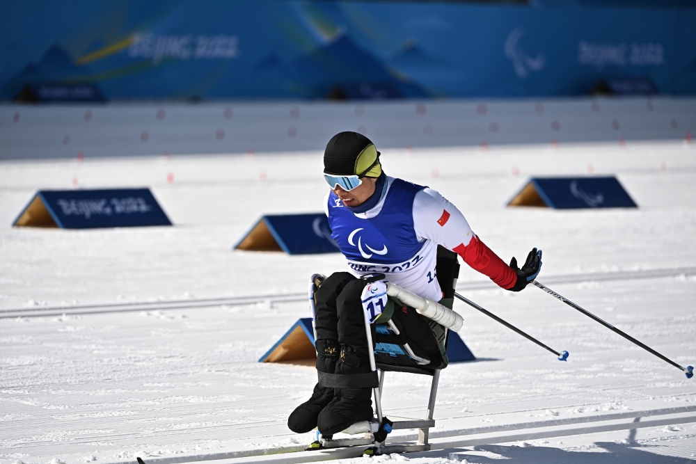 中国选手毛忠武在男子长距离(坐姿)比赛中(3月6日摄)。新华社记者 赵子硕 摄