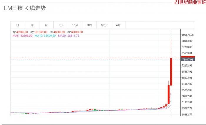 3月8日,伦敦金属交易所(LME)镍价暴涨60%,价格突破8万美元/吨。两天前,其价格才3万美元/吨。