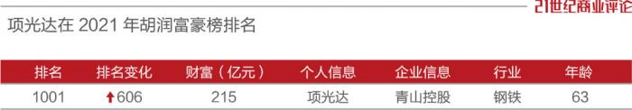 温州人项光达持有46.8%的青山股权,2021年以215亿跻身胡润富豪榜。