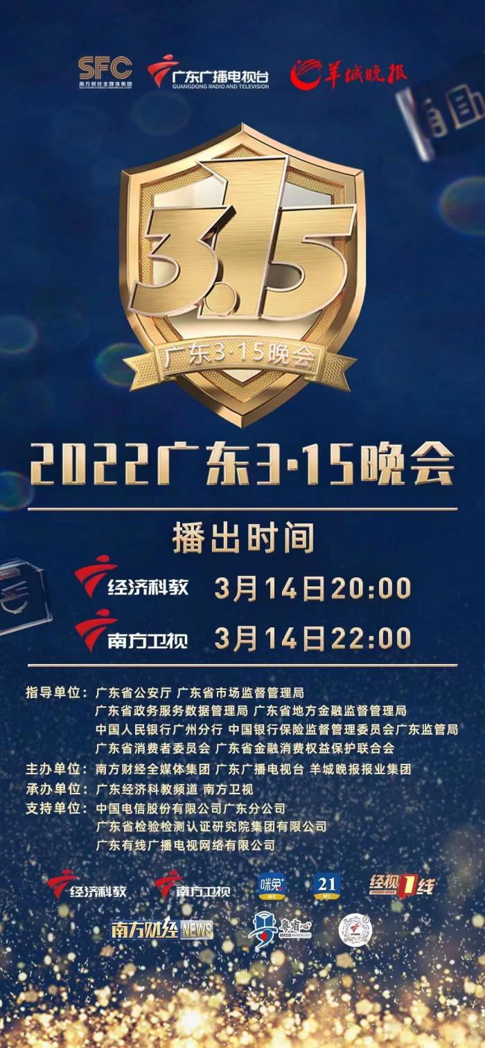 2022广东315晚会,特别邀请广东省公安厅、广东省市场监督管理局、广东省政务服务数据管理局、广东省地方金融监管局、中国人民银行广州分行、广东银保监局、广东省消费者委员会、广东省金融消费权益保护联合会担任单位指导,由南方财经全媒体集团、广东广播电视台、羊城晚报报业集团联合主办;由广东经济科教频道、南方卫视承办,得到中国电信股份有限公司广东分公司、广东省检验检测认证研究院集团有限公司、广东有线广播电视网络有限公司等单位的大力支持。