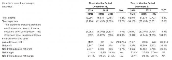 据披露,2021年全年,陆金所实现总营收618.35亿元(人民币,单位下同),同比增长18.8%;全年净利润为167.09亿元,同比增长36.1%,经非国际财务报告准则调整后的净利润为175.61亿元,同比增长29.1%。就2021年第四季度而言,陆金所实现总收入158.31亿元,同比增加19.2%;实现净利润28.96亿元,同比增加1.7%;非国际财务报告准则调整后的净利润为34.09亿元,同比增加19.7%。