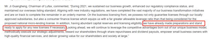 陆金所董事长冀光恒在业绩报告中提到:“在商业许可方面,我们不仅拥有获得担保牌照的子公司,还拥有消费金融牌照,这使我们获得了比小额贷款牌照更高的杠杆率。此外,我们拥有充足的资本储备和许可资质,我们已经做好了准备,并随时准备在必要时申请任何新的许可证。”