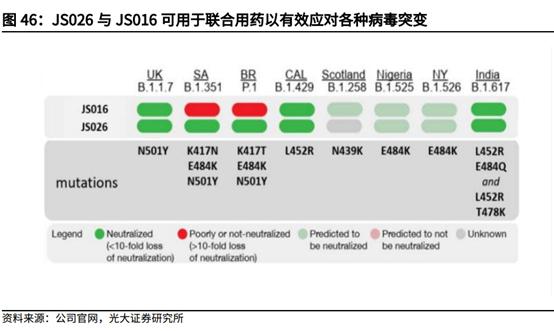 ②针对新冠治疗药物展开全面布局。新冠小分子口服药VV116(RdRp抑制剂)在乌兹别克斯坦获批EUA,两项国际多中心II/III期临床研究正在顺利进行;第二款小分子口服新冠药物VV993(3CL蛋白酶抑制剂)将加快将其推进至临床阶段;新冠中和抗体鸡尾酒疗法(君实JS016+礼来LY-CoV555)获FDA和其他超过15个国家和地区批准EUA,给欧美国家供货约130万剂;新型中和抗体JS026具有与JS016联合用药避免病毒逃逸的潜力,目前IND申请已在国内获批。