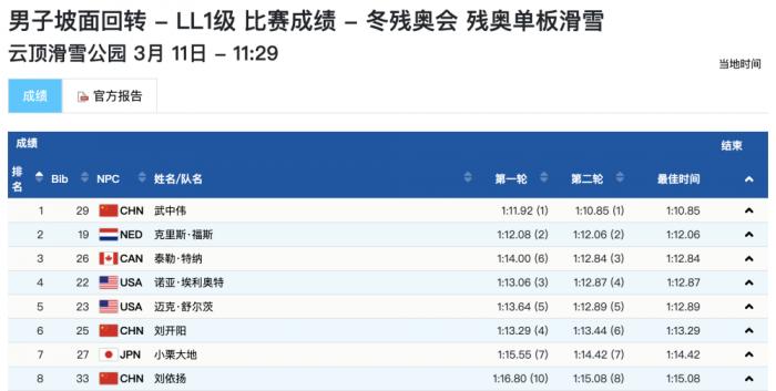 武中伟夺得残奥单板滑雪男子坡面回转LL1级金牌