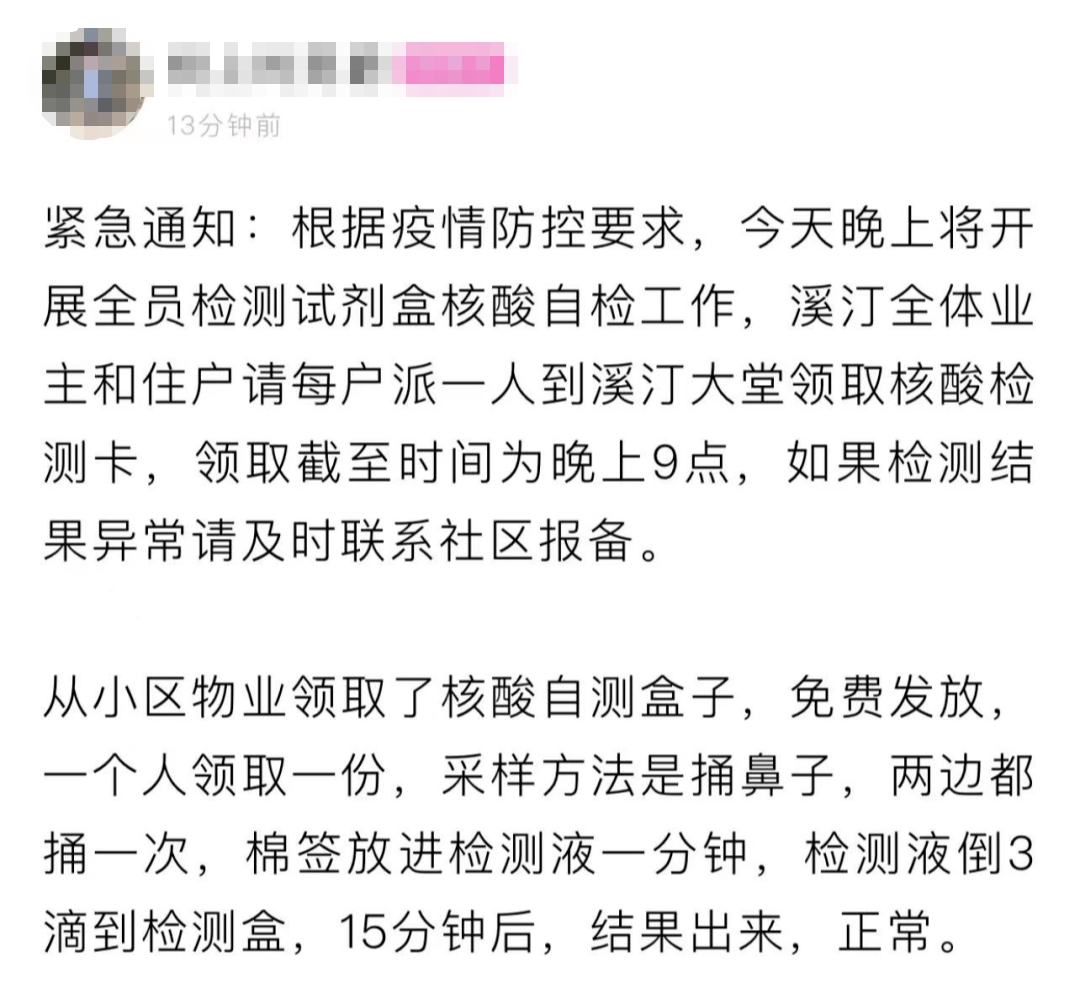 有杭州网友称:溪汀全体业主和住户请每户派一人到溪汀大堂领取核酸检测卡。