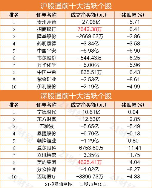 十大活跃个股方面,贵州茅台、东方财富、宁德时代分别被北向资金净卖出27.06亿元、12.53亿元、10.61亿元。招商银行净买入额居首,金额为0.76亿元,此外净买入美的集团0.46亿元。