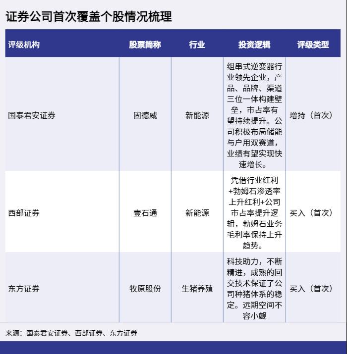 3月10日至13日,证券公司研究报告首次覆盖的上市公司中,包括固德威、牧原股份和壹石通,分属于新能源和生猪养殖行业。